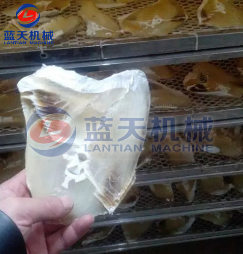 4、烘干:將魚體洗刷一次,除去沾染的污物,滴干水后,排放于特制的烘干盤上。推進熱泵烘干房,開啟主機的控制面板進行烘干,烘干過程由電腦版全自動控制,無需人工值守,一般海魚的烘干時間在22——28個小時左右。
