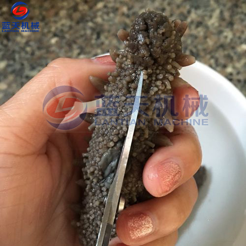 第一步:海參剪口擠腸:海參用清水清洗一下,從其腹部用剪子剪開(kāi)兩三厘米的口,將內(nèi)臟及腸子取出,不去掉腸子,整個(gè)海參都會(huì)化掉。