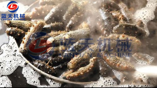 第三步:蒸煮海參:當(dāng)水溫在90度時(shí),將清洗好的海參放入鍋里蒸煮,用工具來(lái)回?cái)嚢?,防止水溫不均,這時(shí)可見(jiàn)到海參迅速縮小,海參刺明顯突出。約半小時(shí)后,撈出海參,視情況拌入粗鹽。