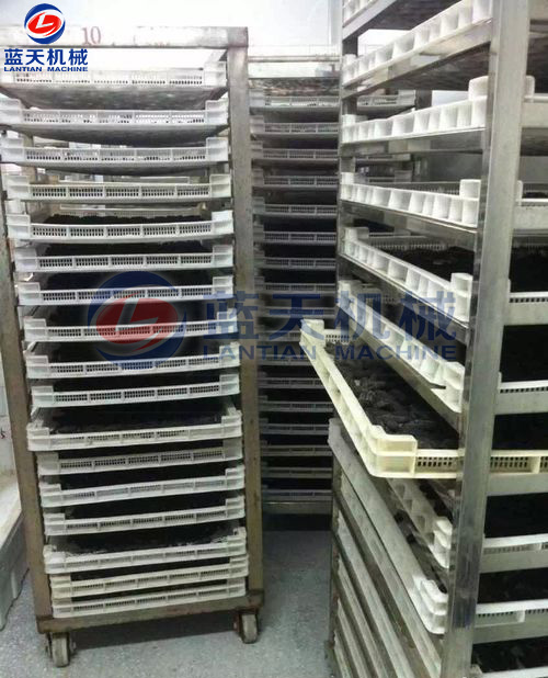 第四步:海參烘干:將煮好的海參擺放在物料盤(pán)上,將擺好海參的物料盤(pán)放置入空氣能熱泵海參烘干機(jī)內(nèi),通過(guò)智能控制系統(tǒng)設(shè)置烘干溫度、濕度和時(shí)間參數(shù),開(kāi)始干燥。