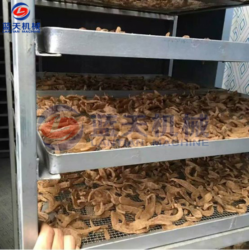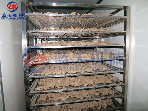 天麻蒸制后,先在烘干機或烘房內(nèi)烘至半干。烘干初期,溫度保持在50~60℃,并保持適當(dāng)通風(fēng)。以后每小時提高0.5℃,逐步提高至65℃。烘干初期若溫度過高,天麻容易出現(xiàn)糠心;溫度過低,通風(fēng)不好時天麻容易變質(zhì)。若天氣晴好,也可日曬夜烘,降低烘干成本。