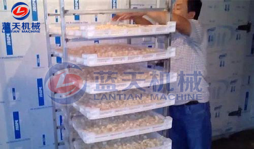 長時間用工切蒜片會受到辛辣味刺激,所以采用機械進行切片處理,蒜面平滑,厚度均勻。切片過程中蒜片的厚薄度非常重要。如切片過厚,當(dāng)厚度為3mm,干蒜片的硫代亞磺酸酯保留率為70%,但蒜片干燥脫水相對要慢。如厚度越厚,不僅烘干效率慢,蒜片色澤會變差,影響品質(zhì)。如切片過薄,為1mm厚時,烘出的蒜片片形不好且碎片率較高,其中硫代亞磺酸酯保留率不到17%。當(dāng)蒜片厚度以1.5-2.5mm時,烘干的色澤、外形佳,而蒜素保留率較高為50-65%,蒜片烘干機干燥蒜片的效率、品質(zhì)和蒜素含量三者達(dá)到最佳點。