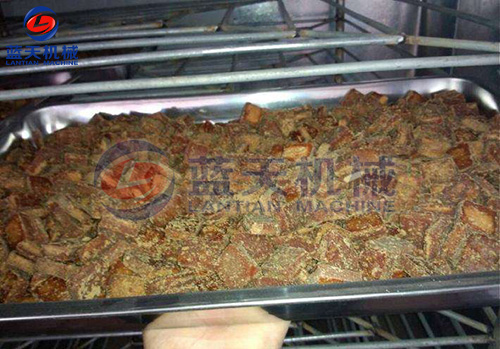 紅糖烘干工藝:將紅糖磚切成方塊狀,置入托盤中,在物料架中分層放好,注意層與層之間的距離,將物料車推入烘干房,開(kāi)始啟動(dòng)溫濕控制系統(tǒng),在紅糖烘干機(jī)的使用過(guò)程中,第一個(gè)小時(shí)可以只升溫不排濕,因?yàn)樵诠ぷ鞯牡谝浑A段,烘干房里面的濕度很低。第二階段設(shè)定為烘干加排濕的工作程序模式。紅糖烘干機(jī)帶有余熱回收功能。在排濕過(guò)程中的熱量會(huì)重新參與到烘干房的熱循環(huán)。排濕過(guò)程當(dāng)中不會(huì)造成熱量浪費(fèi),從而降低了運(yùn)行成本。