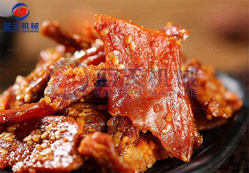 將出鍋的肉塊,置于不銹鋼網(wǎng)盤(pán)中或吊掛于烘烤推車(chē)上,然后推進(jìn)烘房?jī)?nèi)烘烤,溫度為45-60℃,烘烤時(shí)間為3-4小時(shí),即為豬肉干。