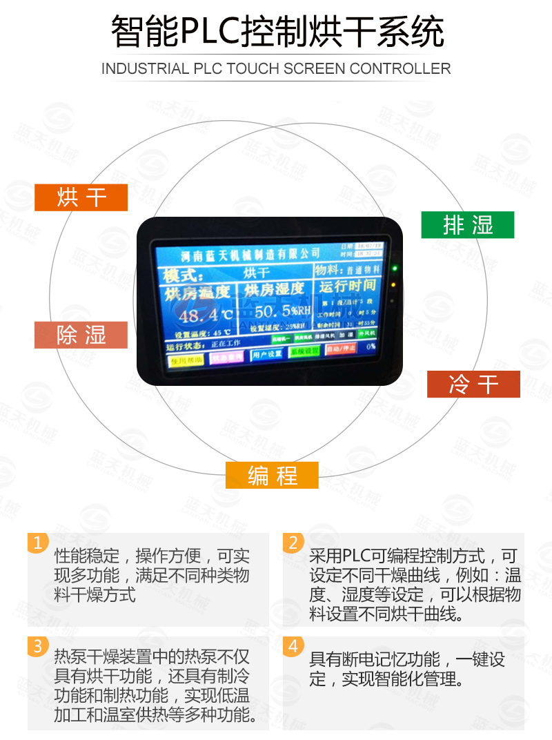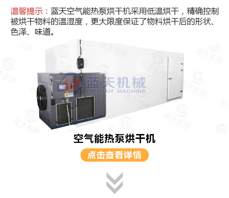 1.熱泵主機產生的熱量經過轉換器轉換成溫度適宜的純凈熱風由風機輸送到烘干機內部;