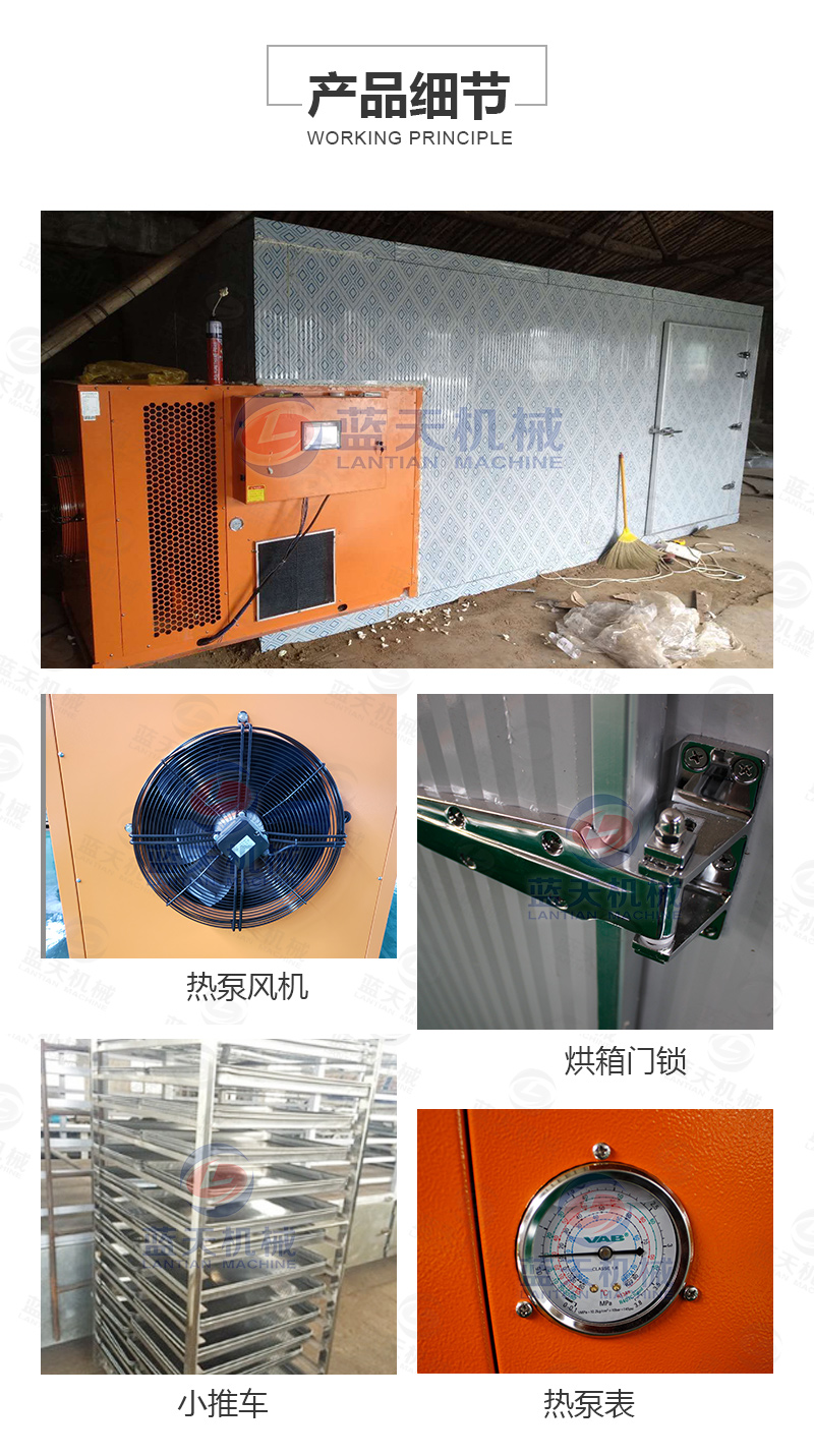 新鮮山楂片的含水率約為80%,烘干的目標含水率約為13%,使用空氣能熱泵小型山楂片烘干機,將智能溫度設定為55度左右的范圍,使山楂片所含的游離水大量蒸發(fā),熱風循環(huán)系統(tǒng)不斷輸送新風,將風量均勻的輸送到各層架,排風,促使蒸發(fā)的水份通過凝結水管路系統(tǒng)排出。