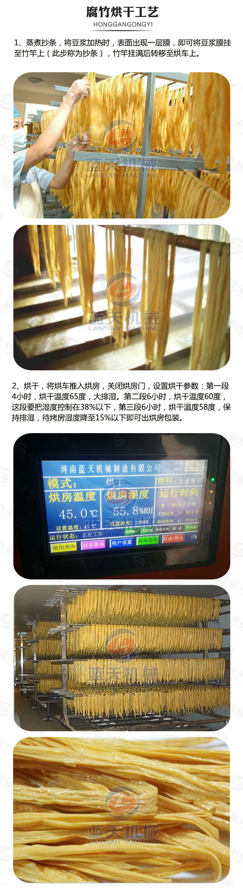 3:腐竹烘干一般經(jīng)歷預(yù)熱50-60℃、高溫烘干大量排濕階段65℃,、恒溫烘干階段60℃,相對濕度控制在50%以下,待水分降至15%左右,降溫階段,烘干時間約5小時,含水量約8%左右即可。這樣腐竹烘干機烘干的腐竹品質(zhì)好,表面的油份和光澤度適當(dāng),不易脆斷,保留了成品的色、香、味、形,且腐竹的損耗小。