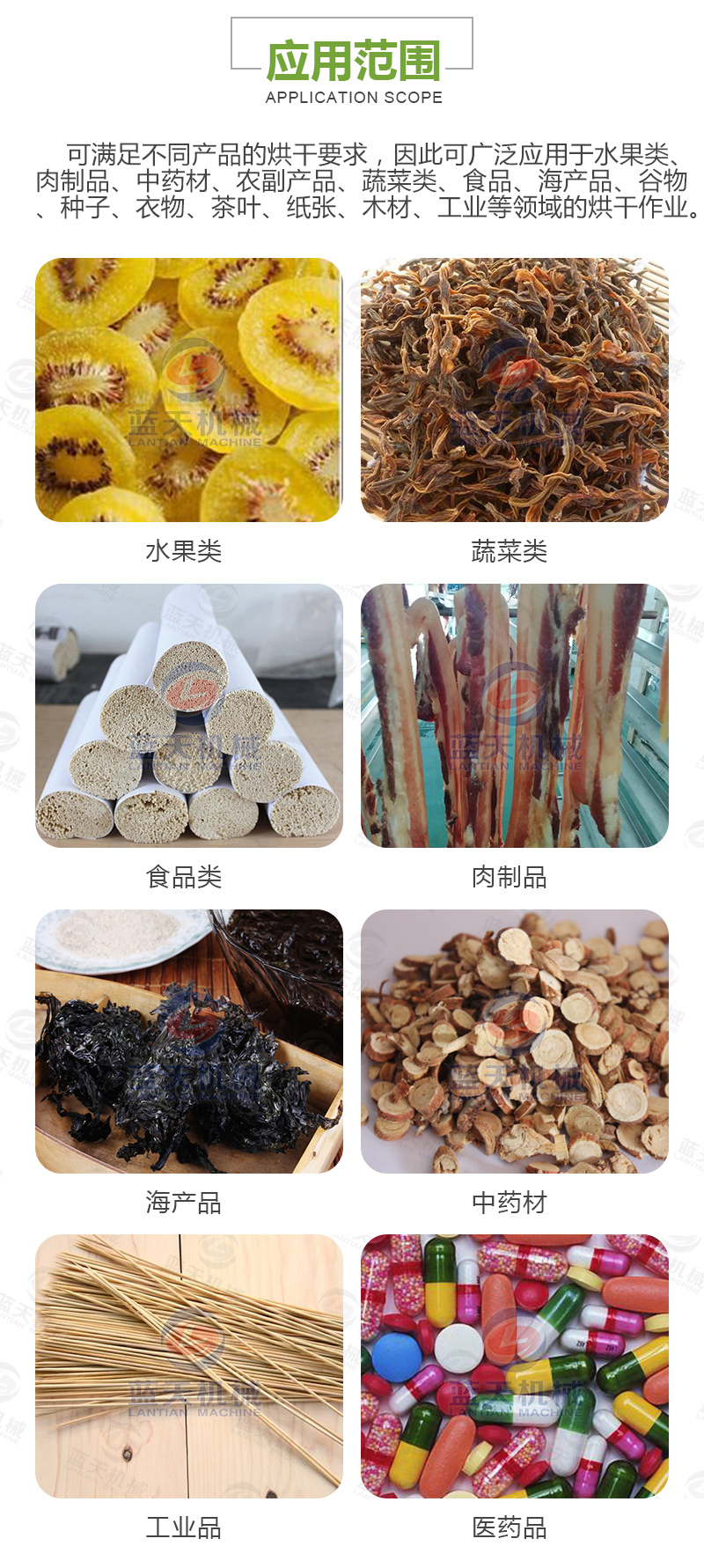 獼猴桃烘干機適用于:果蔬、果脯、肉制品、腸衣、煙葉、皮革、枸杞、烘干蔬菜類(辣椒等),食品(面條、掛面等)