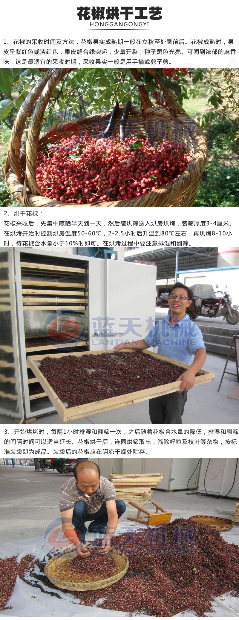 三、晾曬工作晾曬對(duì)花椒品質(zhì)特別對(duì)色澤的影響較大,應(yīng)選晴朗天氣采摘,采摘的椒果要及時(shí)運(yùn)回晾曬,當(dāng)天采收的椒果當(dāng)天晾曬,未曬干的,攤放在避雨通風(fēng)的地方。陰雨天露水過大的天氣不要采摘。目前我們可以采用花椒烘干機(jī),從而快捷、經(jīng)濟(jì)地將剛采摘下來的花椒及時(shí)通過小型花椒烘干機(jī)烘干,保證花椒的色澤和品質(zhì)。但要特別注意溫度調(diào)節(jié)控制,以免影響種子的質(zhì)量。