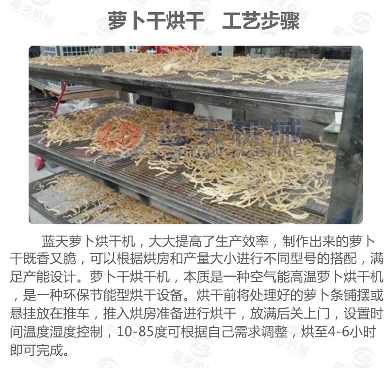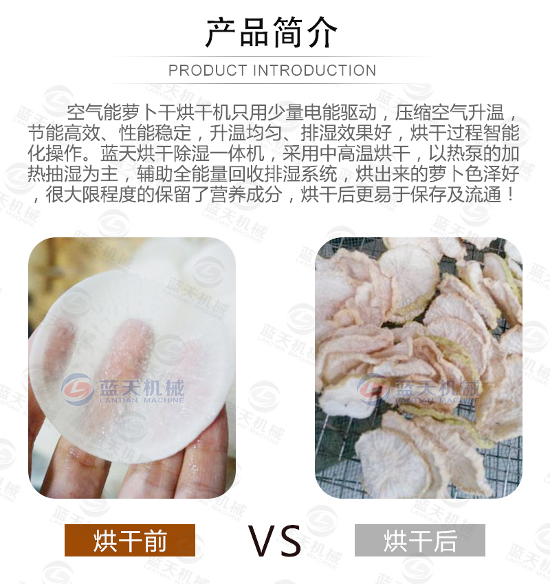 蘿卜干是一種風(fēng)味、具有悠久歷史的食品。傳統(tǒng)蘿卜干加工采用是風(fēng)脫水的方法,利用日照和風(fēng)力,加速蘿卜的蒸騰作用,使蘿卜大量脫水,并利用鹽的高滲透壓來保存。我們介紹一種基于空氣能技術(shù)熱風(fēng)烘干的蘿卜干烘干機(jī)代替日曬來加工蘿卜干,加快蘿卜干加工過程。